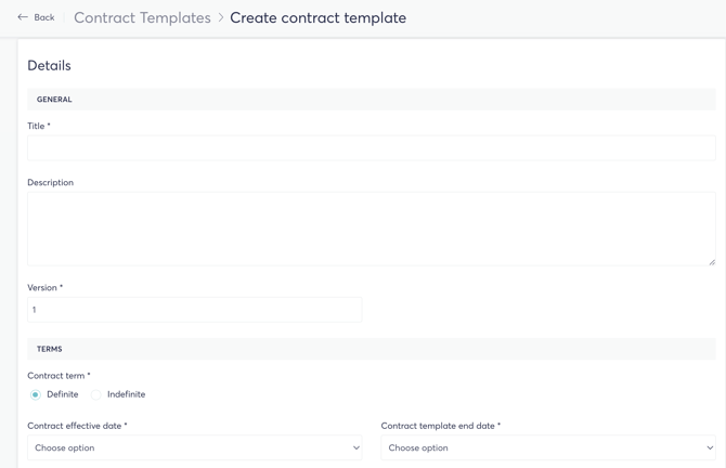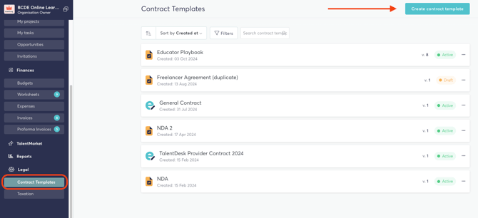 To create a new contract in your account, navigate to 'Contract Templates' under the 'Legal' section in your sidebar menu and click the 'Create contract template' button in the top right corner of the page.