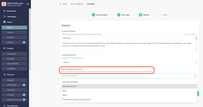 Very little changes from a Manager's perspective when inviting a Provider to the platform using E-sign. As usual, go to your Teams section > Providers > Invite Providers.