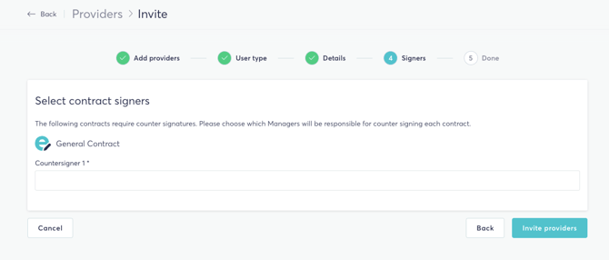If the contract needs to be countersigned by someone in your organization please select 'Yes' under 'Contract countersigning'. You can choose up to 2 Countersignatures. Managers will select the countersigners when they are inviting Providers to the platform.