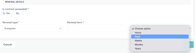 If the contract is renewable, you will be prompted to select whether the renewal type is 'Manual' or 'Evergreen'.