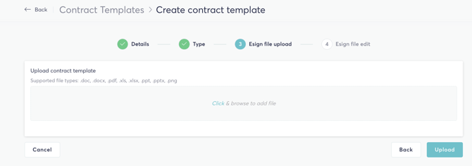 On the next screen, upload the contract as file (see supported file types in the field description) and click 'Upload' at the bottom of the page.