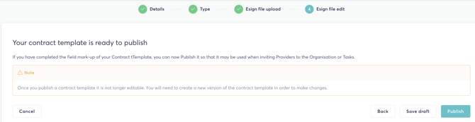 If you click 'Publish' the contract will be available for any Managers in your organization to send to Providers through platform invitations or for ad hoc signatures.