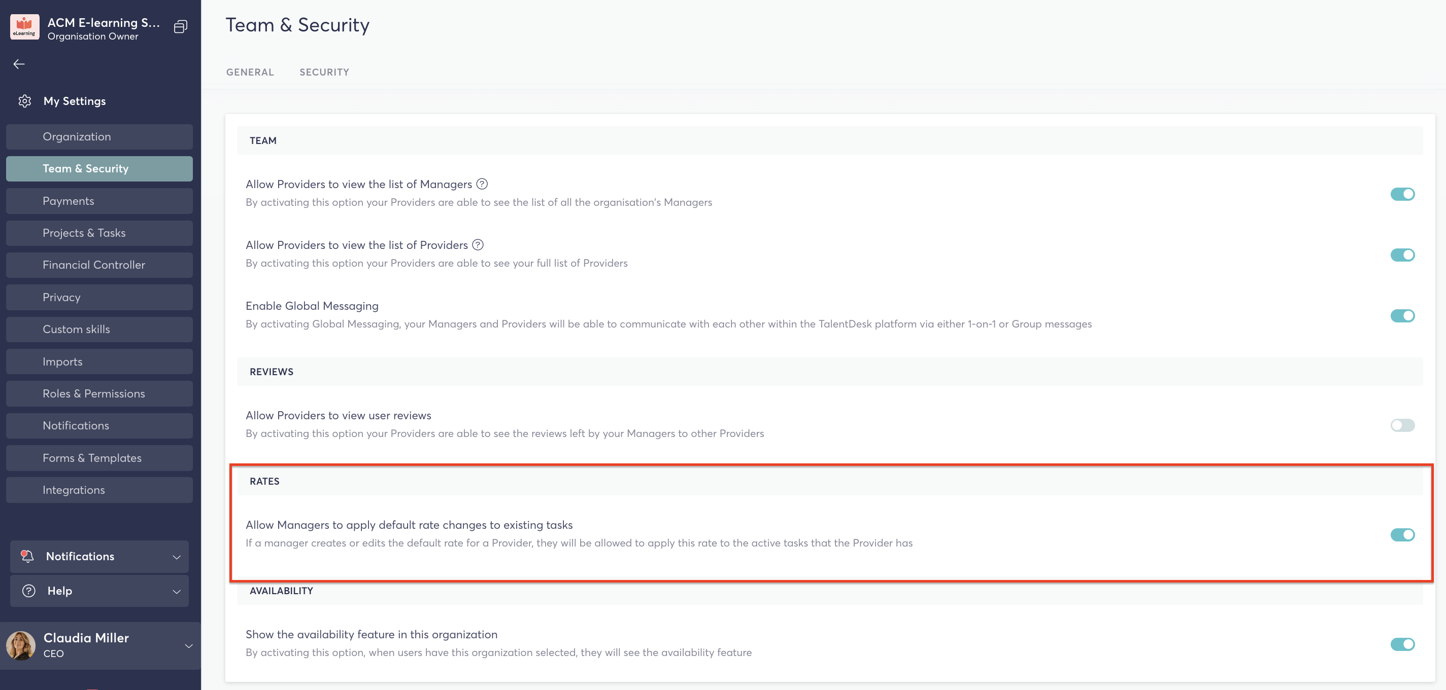 | Organisation Owner | Enable/disable the setting in General Settings |