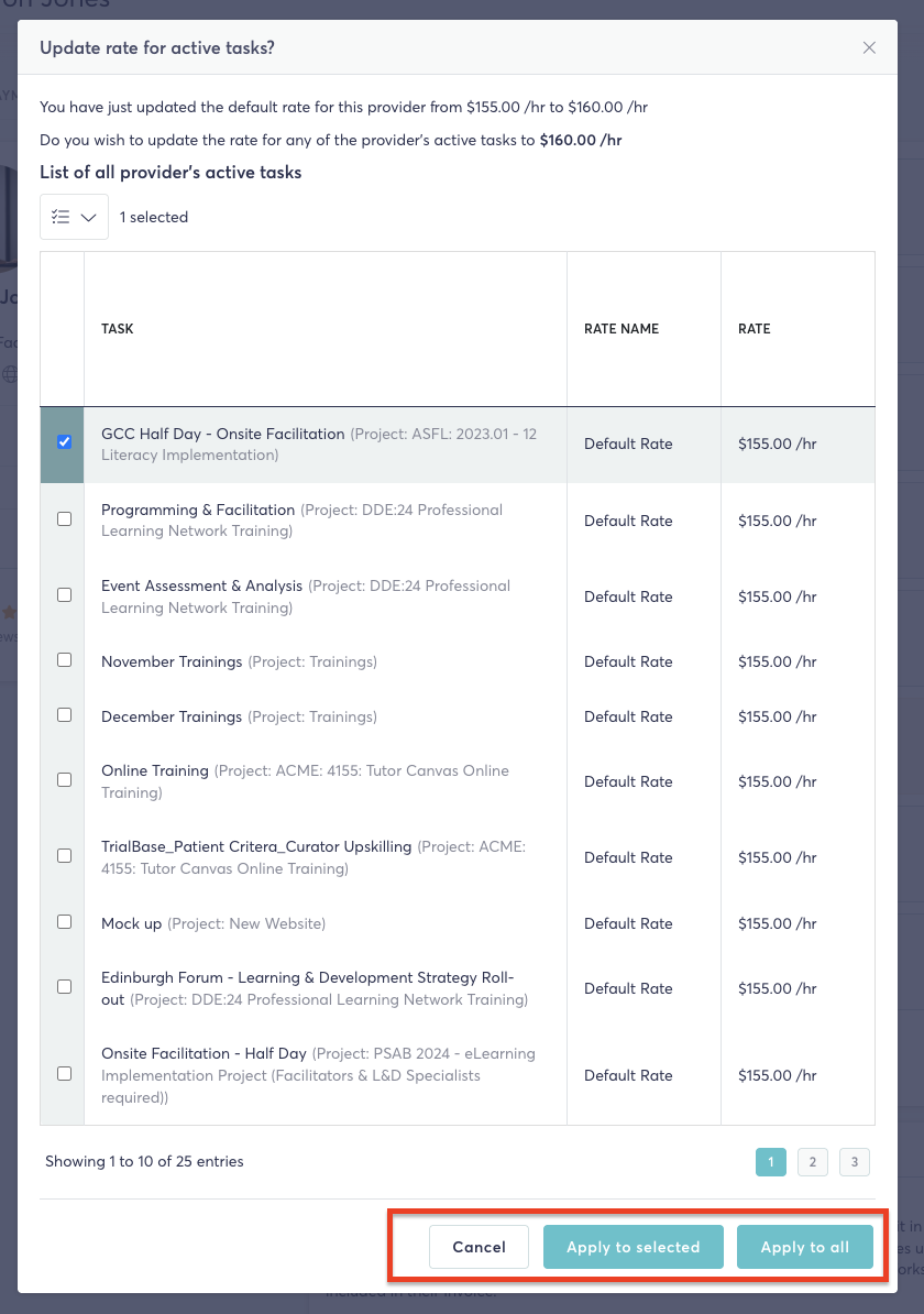 - Apply to all — Updates the rate across all current active task assignments for that provider