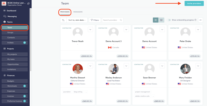 Very little changes from a Manager's perspective when inviting a Provider to the platform using E-sign. As usual, go to your Teams section > Providers > Invite Providers.